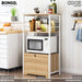 A white Cook oven rack with brown laminated board storage shelves, designed to maximize kitchen space, featuring a microwave on top and a cabinet door.